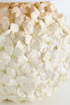 The Aster table lamp is crafted from resin to resemble heavenly hydrageas, lending whimsical charm to any room, and is topped with a linen shade.