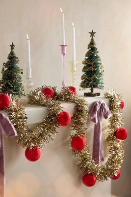 A nostalgic design found only at terrain, 18 bright bauble ornaments bring a cheerful burst of color to this garland of sparkling champagne-colored tinsel.
