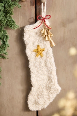 Hand-knitted in Nepal especially for terrain, this wool stocking is finished with a hand-sewn holiday motif and festive embellishments.