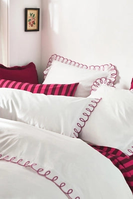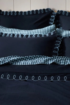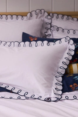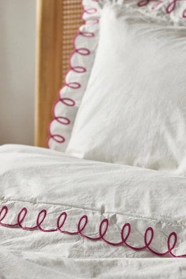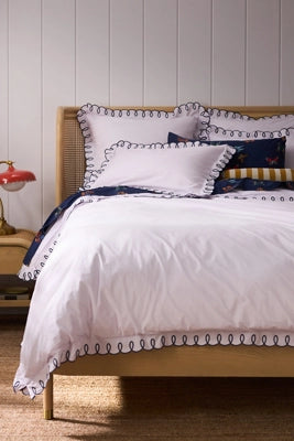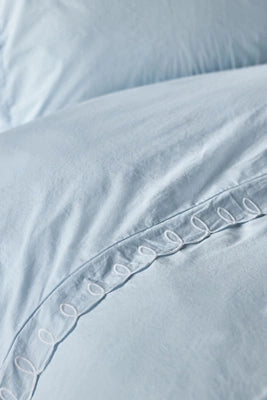 Invite artful flair to your sanctuary with the Looped bedding collection, showcasing a playfully embroidered loop trim. Crafted from crisp, soft organic percale, you'll stay cozy and cool during all your open-window slumbers this season.