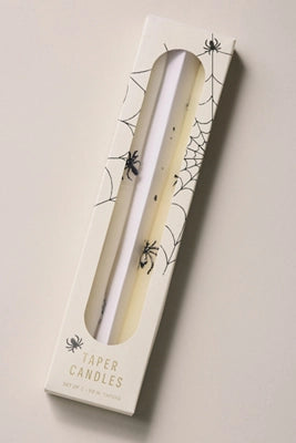 Embrace the spirit of the season with this set of two taper candles, each adorned with friendly spider icons.