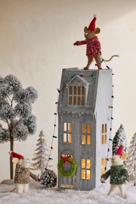 Handmade especially for terrain, this trio of festive wool mice is ready to deck the halls, connected by a strand of colorful holiday lights.